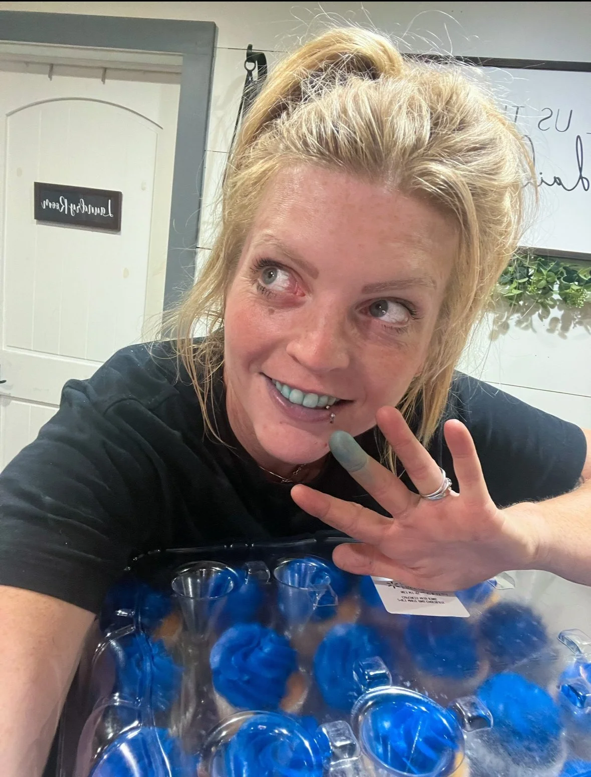 I stuck my finger in a cupcake and pulled it out like ‘Little Jack Horner’ and my entire finger was INSTANTLY dyed blue, as was my mouth and teeth. Let’s just say, they donated a lot of cupcakes the next day, and threw away even more!